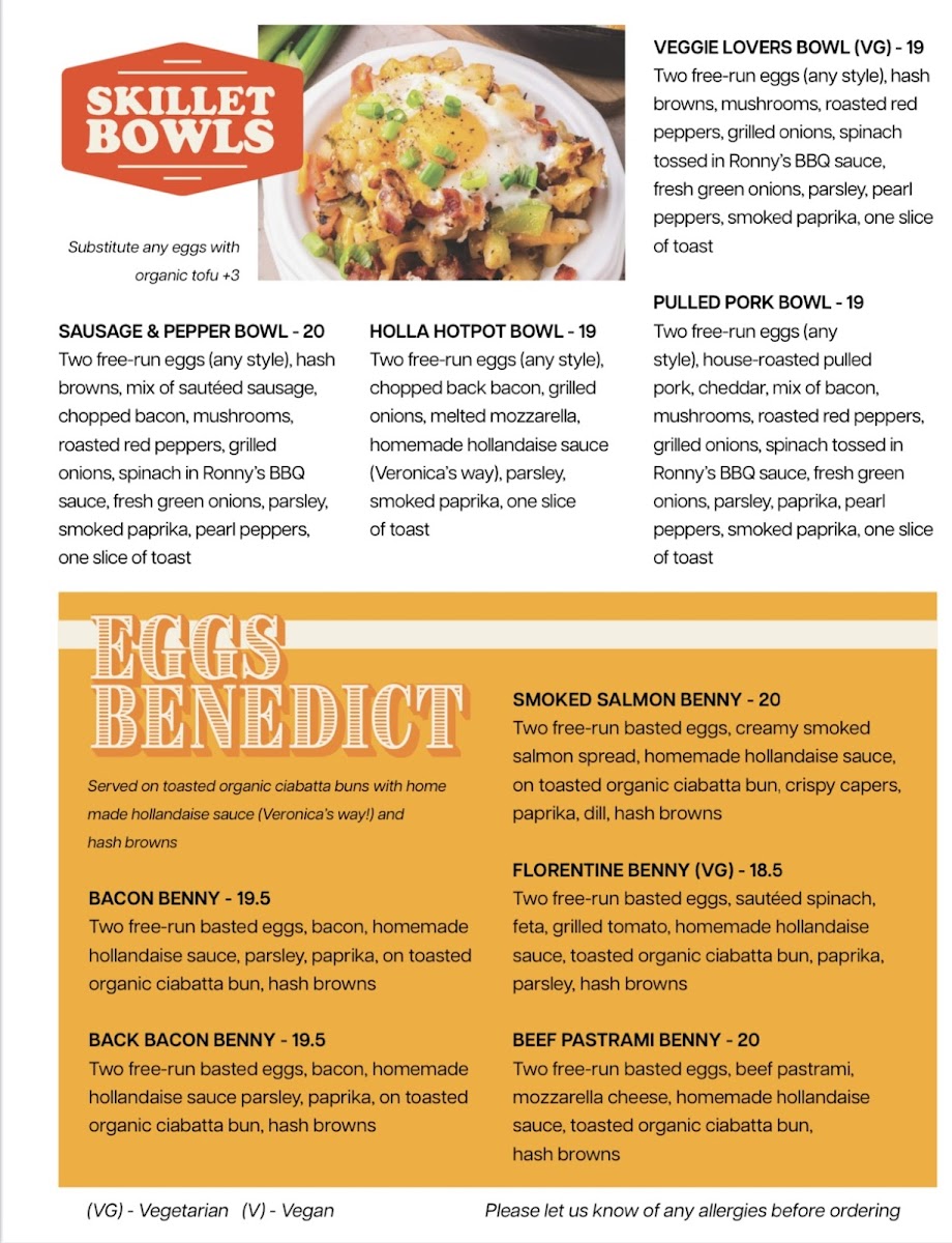 Two free-run eggs (any style), house-roasted pulled pork, cheddar, mix of bacon, grilled onions, roasted red peppers, mushrooms, spinach tossed in Ronny's BBQ sauce, fresh green peppers, parsley, paprika, pearl onions, smoked paprika, one slice of toast