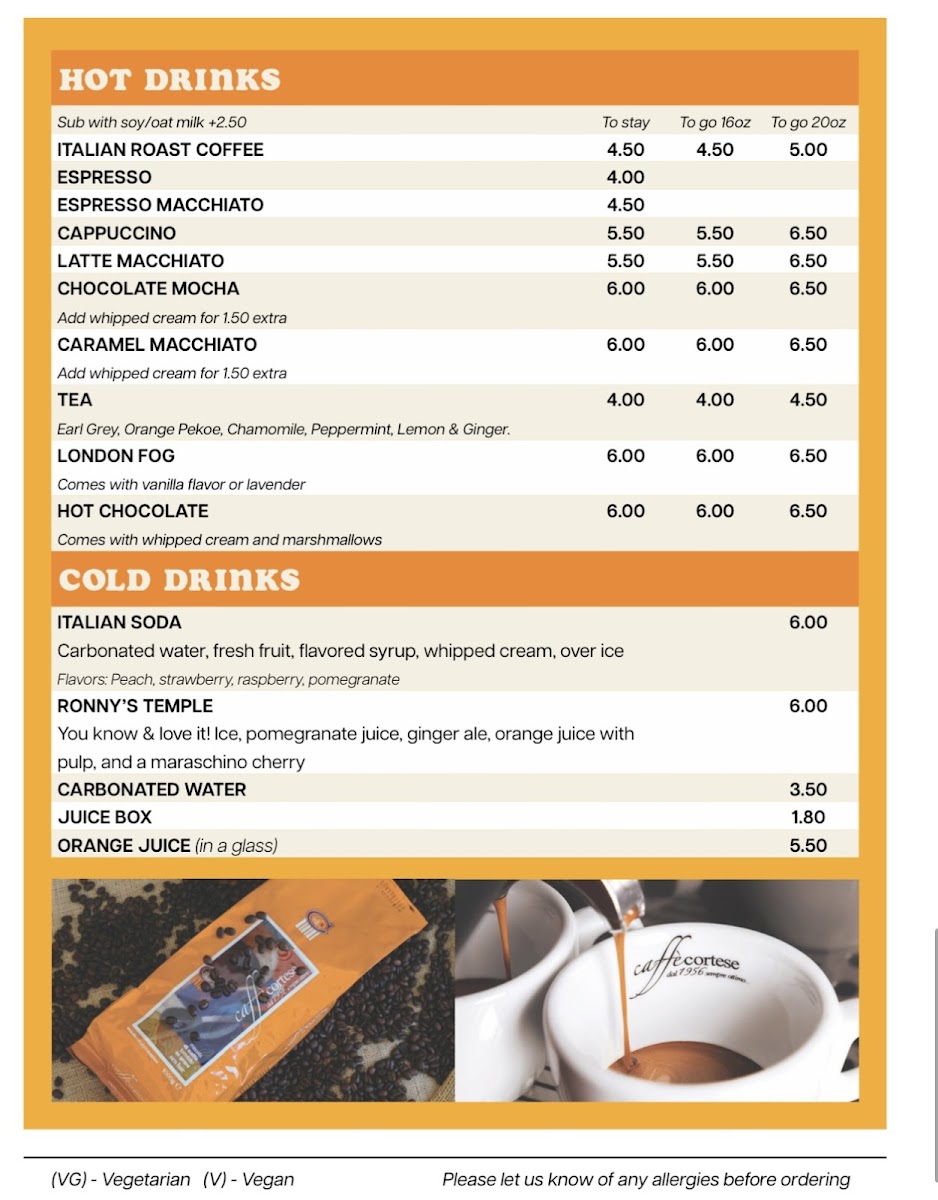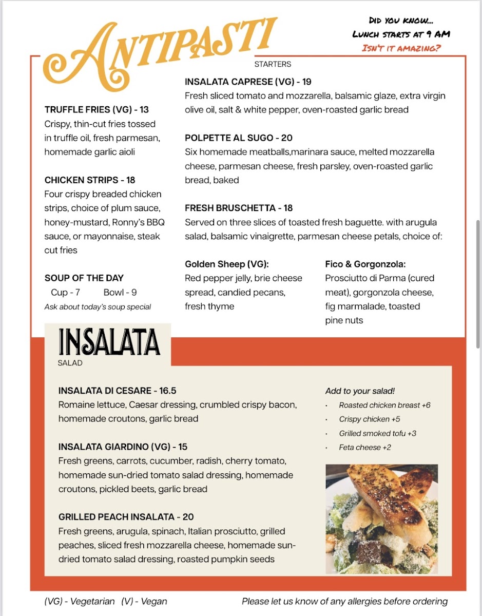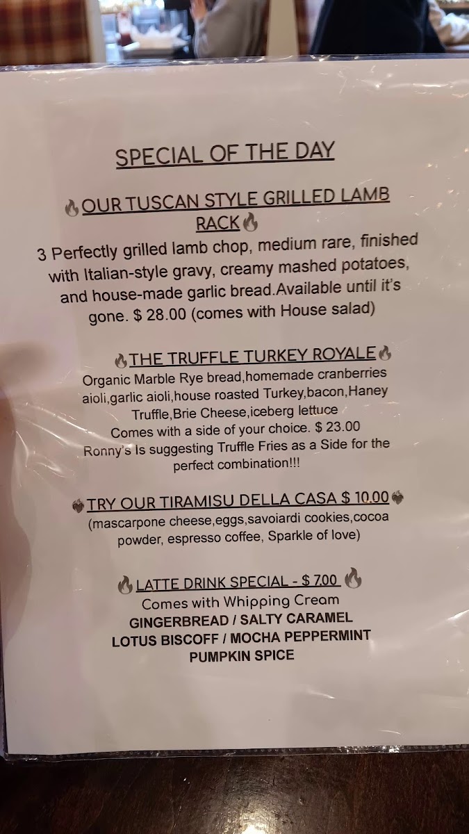 As a reviewer, I see the menu at Ronny's Bistro as a thoughtful and well-rounded reflection of comfort food with Italian inspiration, designed to please a wide range of diners. The journey begins with antipasti like TRUFFLE FRIES (VG), CHICKEN STRIPS, and SOUP OF THE DAY, setting a casual yet flavorful tone. Freshness carries through the insalata section with options such as INSALATA CAPRESE (VG), INSALATA DI CESARE, INSALATA GIARDINO (VG), POLPETTE AL SUGO, and FRESH BRUSCHETTA, offering both light and hearty choices. Beverage selections are equally diverse, from comforting hot drinks like ITALIAN ROAST COFFEE, ESPRESSO MACCHIATO, CAPPUCCINO, and LATTE MACCHIATO, to refreshing cold options including ITALIAN SODA, RONNY’S TEMPLE, CARBONATED WATER, and JUICE BOX.