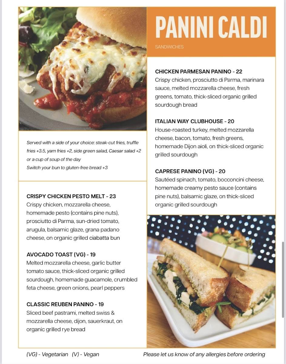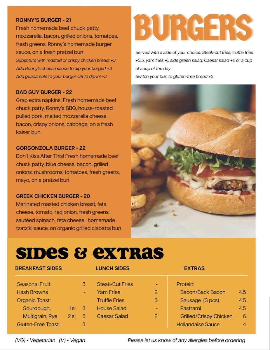 What truly makes the menu memorable is its creativity and balance. The croffle lineup-BANANA JOE CROFFLE (VG), FRAGOLA CROFFLE (VG), CHICKEN & CROFFLES, GOURMET CROFFLE (VG), and LOTUS BISCOFF CROFFLE (VG)-adds a playful twist, while brunch favorites like CLASSIC FRENCH TOAST and ROCK’N RONNY’S FRENCH TOAST deliver indulgent comfort. Burger lovers are well served with RONNY’S BURGER, BAD GUY BURGER, GORGONZOLA BURGER, and GREEK CHICKEN BURGER, complemented by warm panini such as CHICKEN PARMESAN PANINO, ITALIAN WAY CLUBHOUSE, CAPRESE PANINO (VG), CRISPY CHICKEN PESTO MELT, and AVOCADO TOAST (VG).
