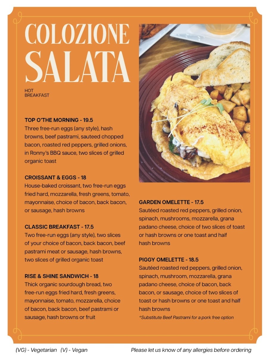 Two free-run eggs (any style), two slices of your choice of bacon, back bacon, beef pastrami or grilled sausage, two slices of meat or organic toast hash browns