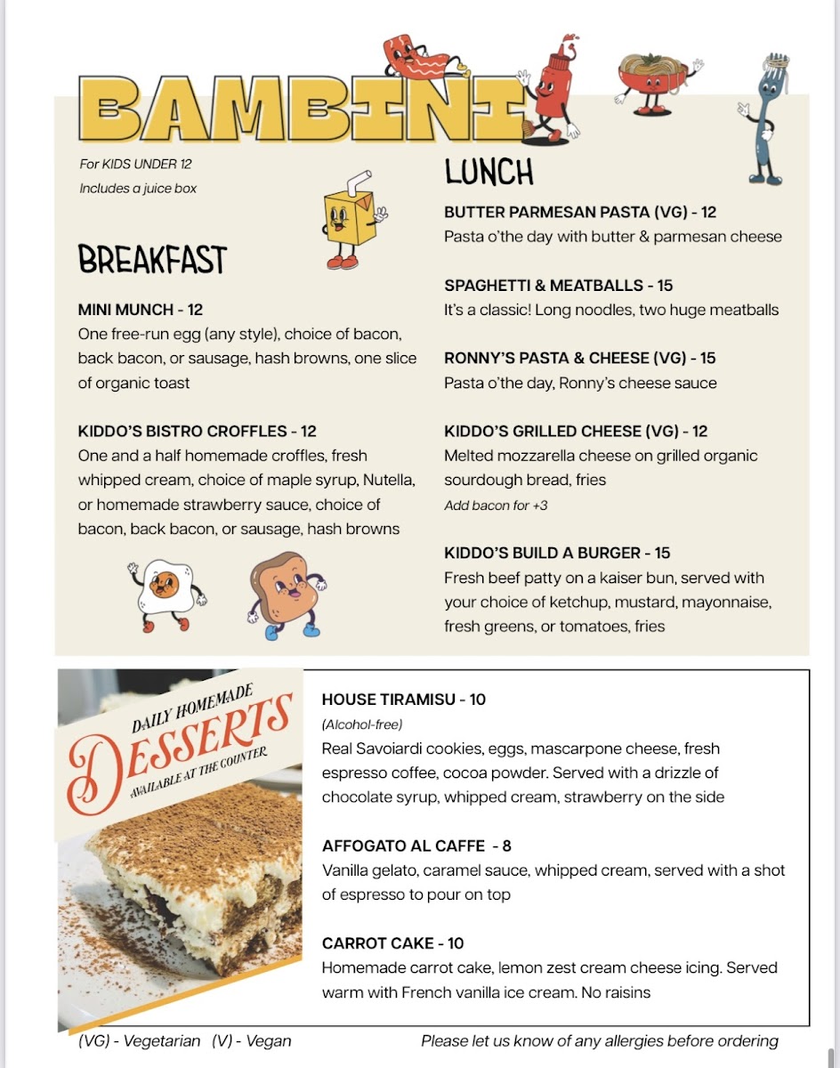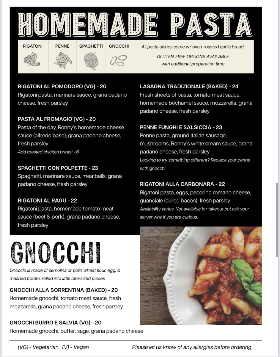 Families will appreciate the Bambini menu, featuring MINI MUNCH, KIDDO’S BISTRO CROFFLES, BUTTER PARMESAN PASTA (VG), SPAGHETTI & MEATBALLS, and RONNY’S PASTA & CHEESE (VG). Italian comfort shines brightest in the homemade pasta and gnocchi selections, including RIGATONI AL POMODORO (VG), PASTA AL FROMAGIO (VG), SPAGHETTI CON POLPETTE, RIGATONI AL RAGU, LASAGNA TRADIZIONALE (BAKED), GNOCCHI ALLA SORRENTINA (BAKED), HOMEMADE GNOCCHI, TOMATO MEAT SAUCE, and GNOCCHI BURRO E SALVIA (VG). Add in hearty breakfast plates, skillet bowls, indulgent eggs benedict variations, and desserts like HOUSE TIRAMISU, AFFOGATO AL CAFFE, and CARROT CAKE, and it’s clear that Ronny’s Bistro offers a complete, satisfying dining experience from morning to night.