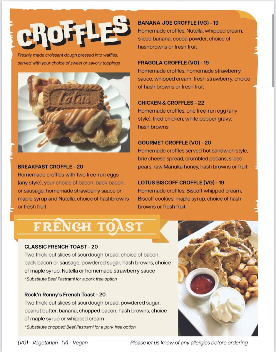 Homemade croffles with two free-run eggs (any style), your choice of bacon, back bacon, or sausage, homemade strawberry sauce or maple syrup and Nutella, choice of hashbrowns or fresh fruit